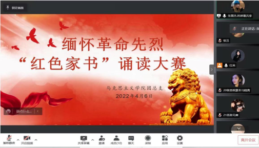 为弘扬革命精神,重温革命历史、缅怀革命先烈,传承红色基因,营造浓厚的“读好书,读红色经典”的氛围,切实引导青年学生以习近平新时代中国特色社会主义思想为根本遵循。MG冰球突破官网于2022年4月6日在线上举办缅怀革命先烈“红色家书”诵读比赛。
