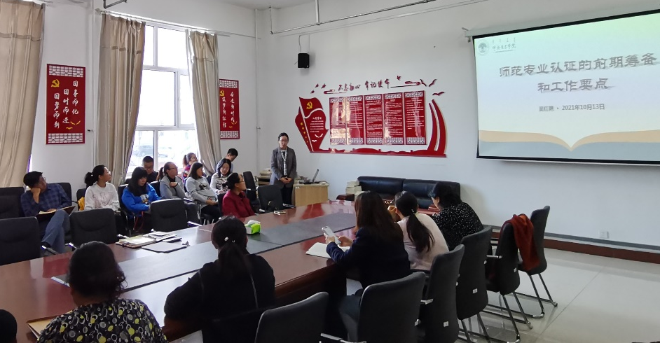 10月13日下午,MG冰球突破官网在崇文楼B123会议室召开师范专业认证主题学习会。数学与统计学院的吴红艳老师莅临我院对师范专业认证的前期筹备和工作要点进行指导。MG冰球突破官网全体教师参加会议,学院副院长吴秀芳主持会议。