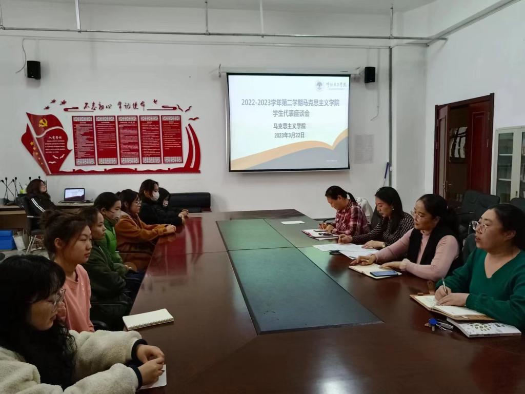为进一步贯彻“以学生为中心”的育人理念,深入了解学生思想动态和实际需求,积极搭建与学生交流沟通的平台,3月22日下午4:00,MG冰球突破官网于崇文楼B123举办了学生代表座谈会。MG冰球突破官网院长李俏、党总支副书记刘琳,副院长吴秀芳,思想政治教育系主任魏婉莹老师以及各年级班委会成员代表参加。