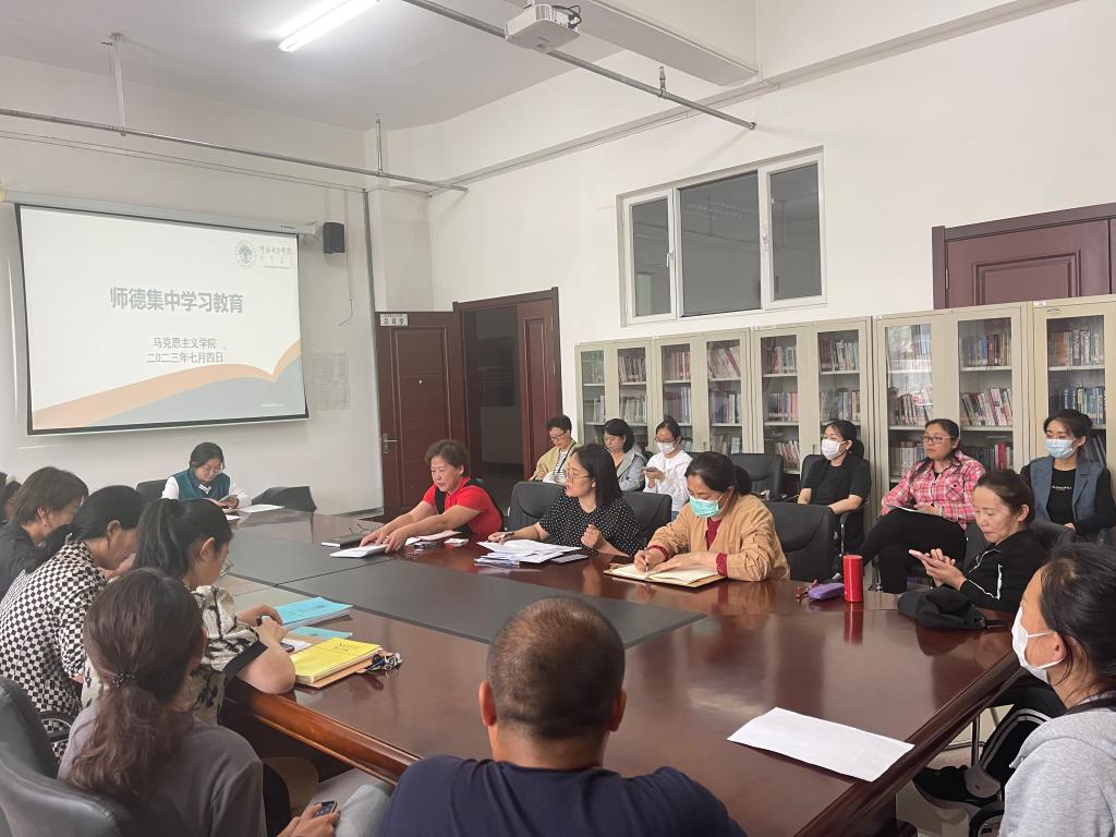 为深入学习贯彻习近平新时代中国特色社会主义思想,贯通学习习近平总书记关于教育的重要论述和指示批示精神,坚决落实师德师风第一标准,把握师德师风建设工作面临的新形势新要求,2023年7月4日,MG冰球突破官网在崇文楼B123会议室召开师德集中学习教育,学院全体教师参加学习。