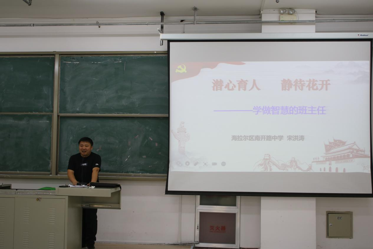 为扎实推进师范类专业认证工作,提高师范生综合育人和班级管理能力,MG冰球突破官网于2023年11月18日在崇文楼B101教室开展《潜心育人 静待花开》专题讲座。本次讲座由海拉尔市南开路中学一级教师、内蒙古自治区教学能手宋洪涛老师主讲,学院20级全体学生聆听讲座。